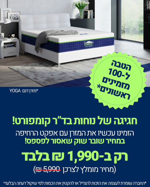 זה הזמן לשפר את איכות השינה שלכם ולהצטרף לעשרות אלפי הלקוחות המרוצים של ד״ר קומפורט. אנחנו כאן בשבילכם ולמען בריאותכם – ביום ובלילה.